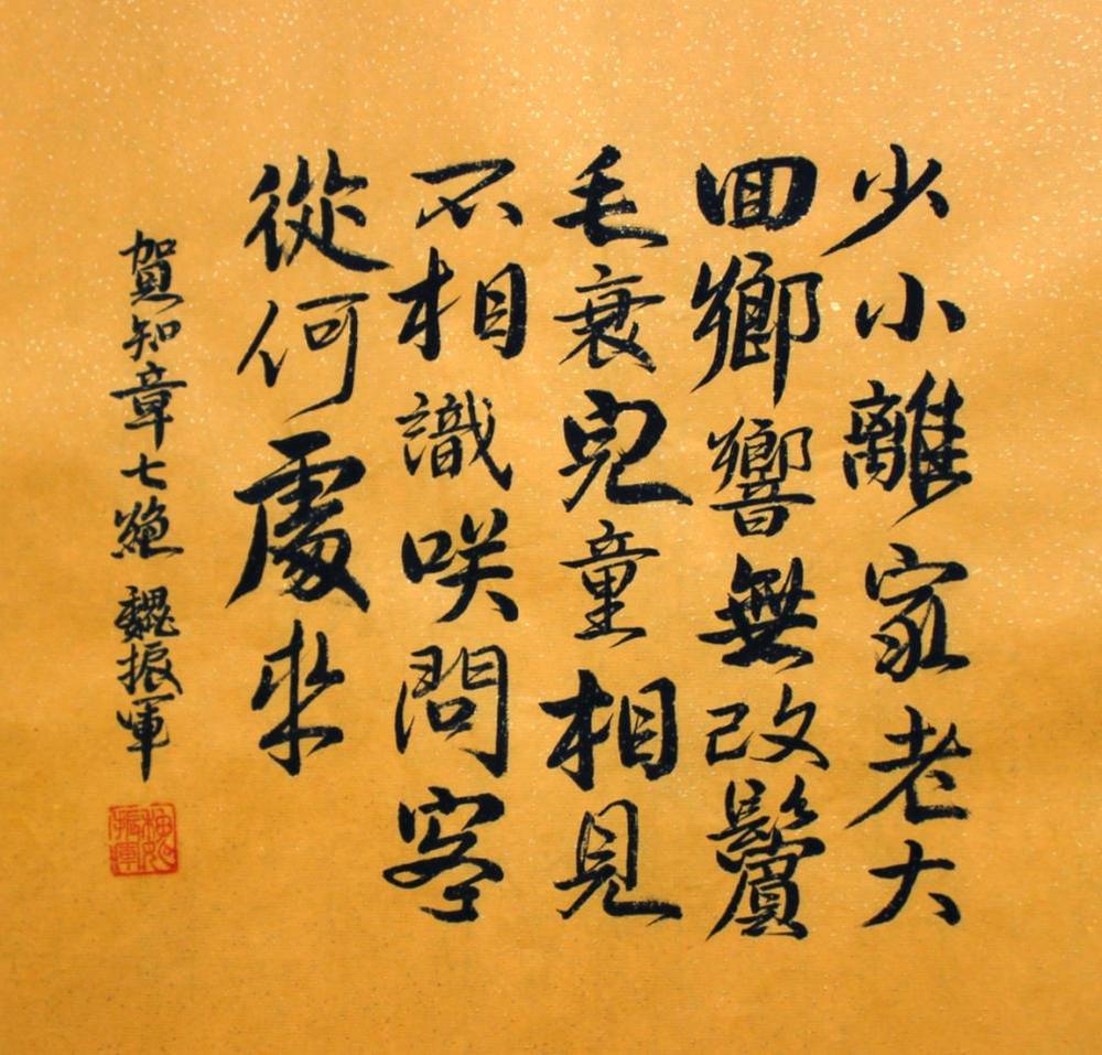 少小离家老大回,乡音无改鬓毛衰。 儿童相见不相识,笑问客从何处来。